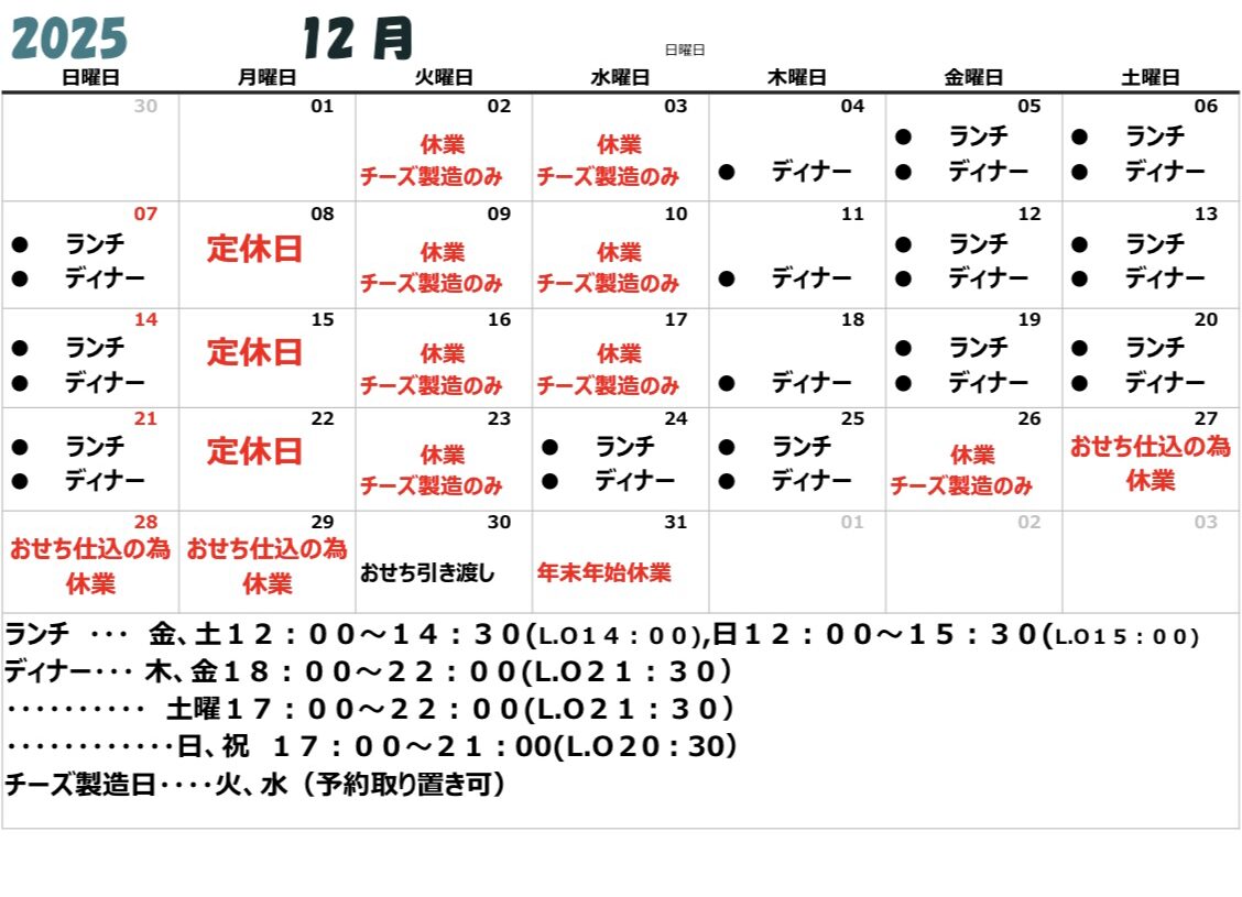 12月の営業日のお知らせ。 2025 12/05 お知らせ 2025年12月4日2025年12月5日 12月の営業日&営業時間のお知らせです。 Contact ご予約・お料理のご相談やご不明な点などございましたらお電話かお問い合わせページよりお気軽にお問い合わせください。 TEL 0467-37-6449 お問い合わせフォームはこちら お知らせ よかったらシェアしてね! URLをコピーしました! URLをコピーしました! 【12月限定】トリュフブッラータチーズ この記事を書いた人 osteriaebottega 関連記事 【12月限定】トリュフブッラータチーズ 2025年10月7日 7周年を記念して、4月17日~19日でハズレなし抽選会を行います。 2025年4月2日 マルシェ出店のお知らせ 2024年9月1日 6月の営業日のお知らせ。21日から水曜日がチーズ販売のみになります。 2023年6月16日 12/11より日曜ランチコースが変更になります。 2022年12月7日 クリスマスオードブル&年末年始オードブルのお知らせ 2022年11月11日 ランチメニューに関するお知らせ 2022年10月24日 Japan cheese awards2022にて銀賞を受賞しました! 2022年10月22日
